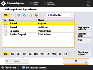Wybierz odbiorcę z <Osobis. lista adresowa>, listę adresową grupy użytkowników, <Lista Adresowa 1> do <Lista Adresowa 10> oraz <Lista adresowa dla administratora>.