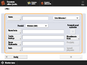 Jeżeli wybierzesz <Windows (SMB)>, pojawią się przyciski <Wyszukiwanie Hosta> oraz <Przeglądaj>. Ułatwia to określenie serwera plików podczas przeglądania lub przeszukiwania sieci.
