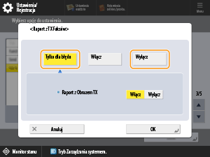 Jeżeli wystąpi błąd wysyłania lub wysyłanie faksu zostanie anulowane, nie zostanie wydrukowany raport TX faksu. Jeśli w tym ustawieniu wybrano <Wyłącz>, postępuj według poniższej procedury, aby nie drukować raportu TX.