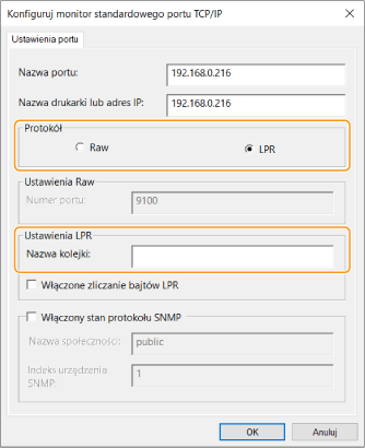 W polu [Protokół], zaznacz [LPR] i wprowadź [Nazwa kolejki] w [Ustawienia LPR].