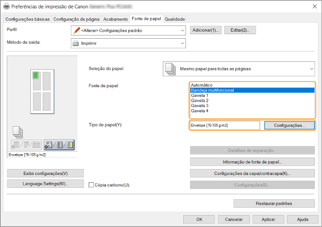 Em [Paper Source], selecione [Multi-purpose Tray] e depois selecione [Envelope] em [Paper Type].
