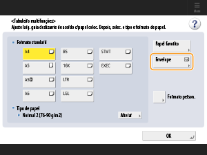 Quando coloca os envelopes no tabuleiro multifunções, é exibido o ecrã para definir o tamanho do papel. Defina o formato de papel como se segue.
