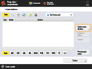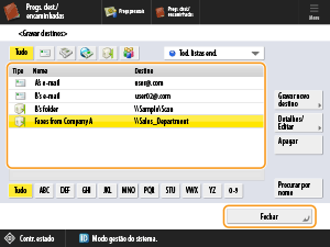 Selecione um destino a partir de <Lista ender. pessoais>, lista de endereços de grupos de utilizadores, <Lista ender. 1> a <Lista ender. 10> ou <Lista endereços para Admin.>.