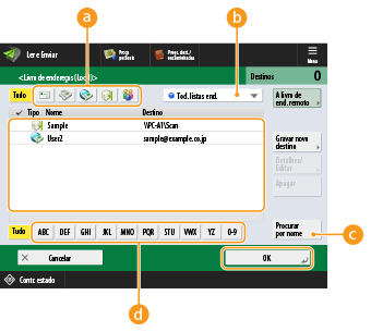 Lista suspensa para seleção de tipos de Livros de EndereçosPermite apresentar um determinado grupo de destinos. Quando tiver iniciado sessão na máquina com a gestão de autenticação pessoal, selecionar <Lista ender. pessoais> apresenta o seu livro de endereços pessoal.
