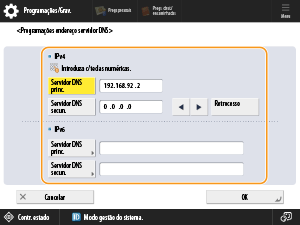 Se houver um servidor DNS secundário, carregue em <Servidor DNS secun.> e introduza o respetivo endereço IP. Não pode introduzir endereços que comecem por "ff" (endereços multicast), endereços compostos apenas por zeros (0), nem endereços locais de ligação. Para prosseguir sem especificar um servidor DNS secundário, deixe o campo em branco.