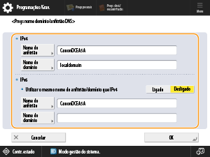 Quando o nome do anfitrião e o nome do domínio forem iguais aos definidos para IPv4, carregue em <Ligado> em <Utilizar o mesmo nome de anfitrião/domínio que IPv4>. Para definir programações diferentes, carregue em <Desligado>.