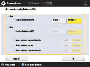 Se carregar em <Ligado> em <Atualização dinâmica DNS>, estas programações são atualizadas automaticamente quando o nome do anfitrião atribuído e o endereço IP mudarem em ambientes como DHCP.