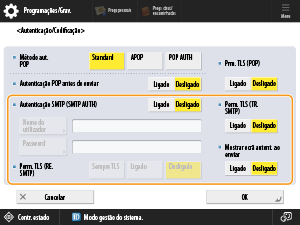 Para encriptar a comunicação através de TLS na receção de e-mail e de I-faxes com o servidor SMTP, carregue em <Sempre TLS> ou em <Ligado>. Se não quiser receber nada a não ser dados encriptados, selecione <Sempre TLS>.