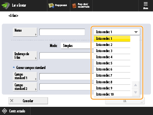 <Lista ender. 1> a <Lista ender. 10> podem ser vistas como 10 livros de endereços. A gravação de destinos em listas de endereços para cada departamento ou parceiro de negócios torna mais fácil encontrar destinos ao especificá-los. Isto também torna mais fácil gerir listas de endereços mudando simplesmente o nome de um departamento ou parceiro de negócios.