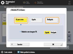 Se ocorrer um erro de envio do fax ou a transmissão for cancelada, não será impresso um relatório TR de fax. Quando nesta programação for selecionado <Desligado>, use o procedimento abaixo para não imprimir um relatório TR.