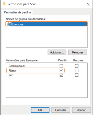 Em [Nomes de grupos ou utilizadores], selecione [Todos] e selecione o caixa de seleção [Permitir] em [Alterar].