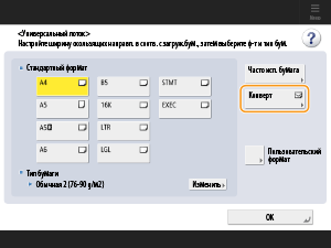 При загрузке конвертов в универсальный лоток отображается экран установки формата бумаги. Задайте формат бумаги, как показано ниже.