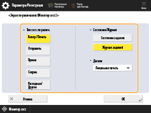 В разделе <Тип сост. по умолч.> выберите <Копир./Печать>, в разделе <Состояние/Журнал> выберите <Журнал заданий>, а в разделе <Детали> выберите <Локальная печать>.