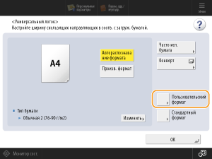 При загрузке бумаги в универсальный лоток отображается экран установки формата и типа бумаги.