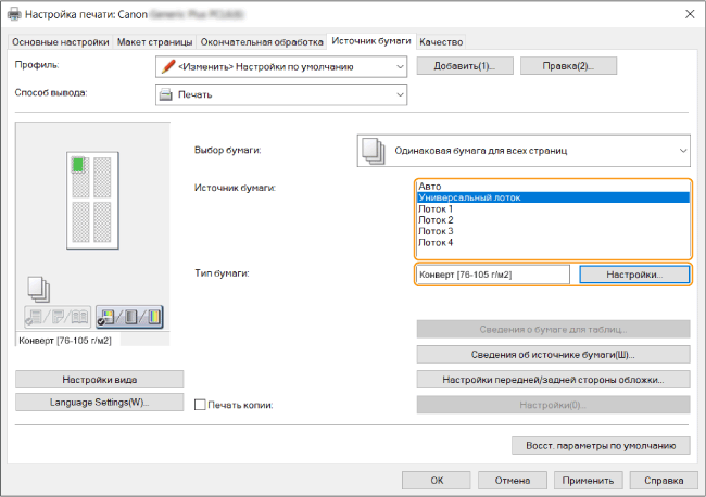 В поле [Источник бумаги] выберите [Multi-purpose Tray], а затем выберите [Конверт] в разделе [Тип бумаги].