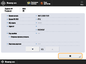 Если документы получены или отправлены без каких-либо проблем, в поле <Результат> отобразится сообщение <OK>. Сообщение <NG> обозначает, что отправка или прием были отменены либо выполнены с ошибками.