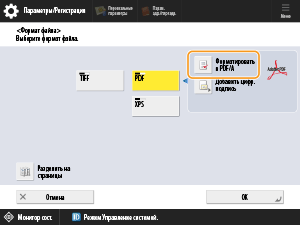 Нажмите <PDF>, выберите параметры, которые соответствуют применяемому файлу, а затем нажмите кнопку <OK>.