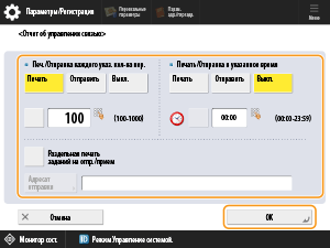 Если для параметра <Показать журнал заданий> в разделе <Параметры управления> задано значение <Выкл.>, нельзя настроить параметры отчетов об управлении связью. Кроме того, если изменить значение параметра <Показать журнал заданий> в разделе <Параметры управления> с <Выкл.> на <Вкл.>, для таких параметров отчетов об управлении связью, как <Печ./Отправка каждого указ. кол-ва пер.> и <Печать/Отправка в указанное время>, будет автоматически задано значение <Выкл.>.