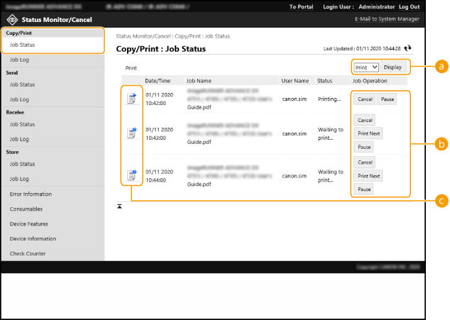 В этом разделе описано, как с помощью Remote UI (Удаленный ИП) проверять состояние заданий на данном аппарате и отменять или возобновлять их выполнение.