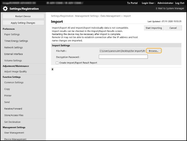 После начала импорта вы не сможете использовать Remote UI (Удаленный ИП), пока данный аппарат не будет перезагружен. Кроме того, обратите внимание, что параметры вступают в силу только после перезагрузки.