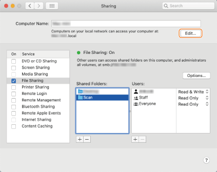 Имя компьютера также отображается в разделе [Имя компьютера] в окне Sharing, однако данное имя может быть недоступно для использования в сети. Обязательно проверьте данные, выполнив указанную ниже процедуру.