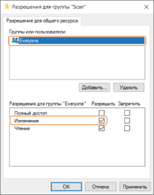 В меню [Группы или пользователи] выберите [Все], а затем установите флажок [Разрешить] в разделе [Изменить].