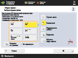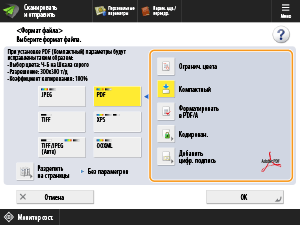 Если выбран формат <PDF>, <XPS> или <OOXML>, можно также задать различные дополнительные функции. Чтобы задать параметры, выберите функцию для добавления.