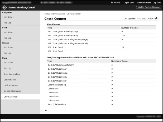 Detta avsnitt beskriver hur du använder den här maskinens räknare för att kontrollera antalet ark som har kopierats, skrivits ut eller skannats.