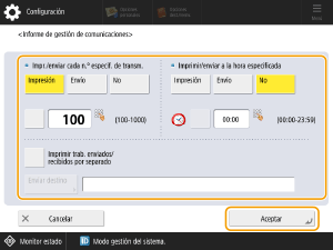 Si <Mostrar registro de trabajos> en <Opciones de gestión> está establecido en <No>, no podrá configurar las opciones del informe de gestión de comunicaciones. Asimismo, si cambia la opción <Mostrar registro de trabajos> de <Opciones de gestión> de <No> a <Sí>, las opciones <Impr./enviar cada n.º especif. de transm.> y <Imprimir/enviar a la hora especificada> de los informes de gestión de comunicaciones se establecen automáticamente en <No>.