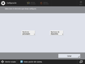 <Opciones personales> o <Opciones de dispositivo> solo aparecen en la pantalla Configuración cuando ha iniciado sesión un administrador. Cuando haya seleccionado alguno de los dos, ya no aparecerán más mientras esté con la sesión iniciada. Si sale de la sesión y vuelve a iniciarla después, volverá a aparecer la pantalla para seleccionar <Opciones personales> o <Opciones de dispositivo>.