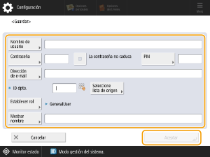 Registre la información del usuario desde la IU remota o desde el panel de control de este equipo. Para registrar cada elemento, utilice la IU remota. Aunque puede utilizar el panel de control de este equipo para registrar información del usuario, no puede utilizarlo para registrar cada elemento.