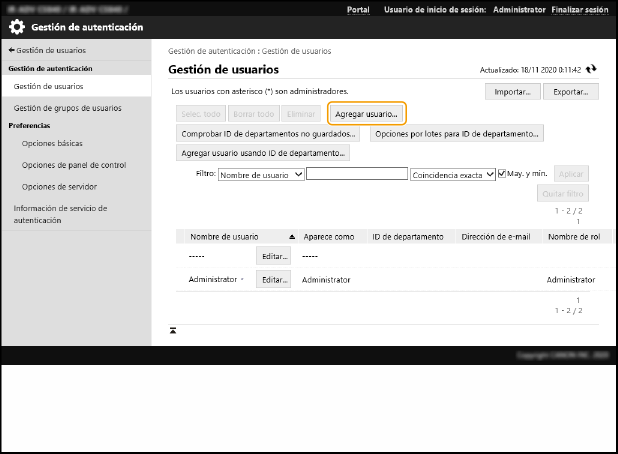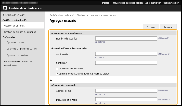 La gestión de usuarios en este equipo se realiza principalmente usando una aplicación de autenticación llamada Autenticación de usuario (servicio con inicio de sesión).