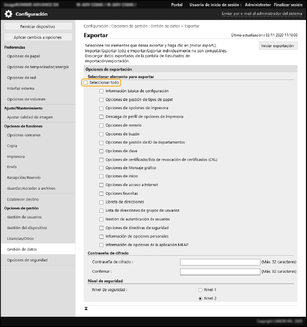 Para cifrar todos los datos de configuración, especifique [Nivel 2] en [Nivel de seguridad].