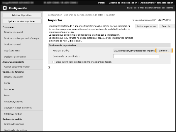 La importación por lotes de los datos de configuración en un ordenador permite, por ejemplo, importar las opciones de un equipo antiguo en un equipo recién instalado. Si utiliza varias impresoras multifunción Canon*, puede utilizar esta función para copiar las opciones de un equipo a otro rápidamente, ahorrándose la molestia de tener que configurar las mismas opciones para veces. Para realizar esta tarea, debe iniciar sesión en la IU remota con privilegios de Administrador.