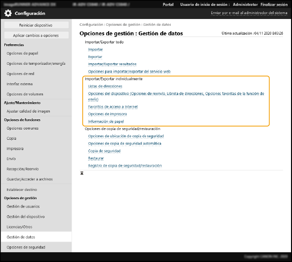 También puede seleccionar opciones concretas para importar o exportar, como listas de direcciones de la Libreta de direcciones u opciones de la impresora. Para realizar esta tarea, inicie sesión con privilegios de Administrador en la IU remota.