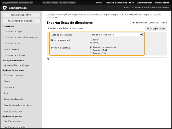 Cuando [Formato de archivo] está establecido en [Formato personalizado], puede configurar el nivel de seguridad. Si selecciona [Nivel 1], podrá importar los datos en cualquier impresora multifunción Canon. Si selecciona [Nivel 2], se cifra la contraseña de los datos de la lista de direcciones con un método más seguro que [Nivel 1]. Sin embargo, eso significa que los datos solo pueden importarse en modelos compatibles con la opción [Nivel 2] (modelos donde el elemento [Nivel de seguridad] aparece en esta opción).