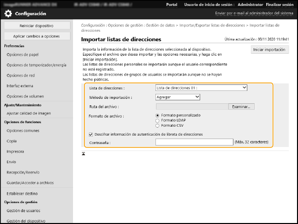 * Se aplica únicamente a impresoras multifunción de la serie imageRUNNER ADVANCE u otros modelos que admiten la importación/exportación por lotes.