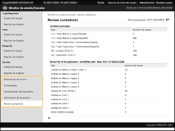 Muestra el número de páginas copiadas, impresas, enviadas por fax y escaneadas.