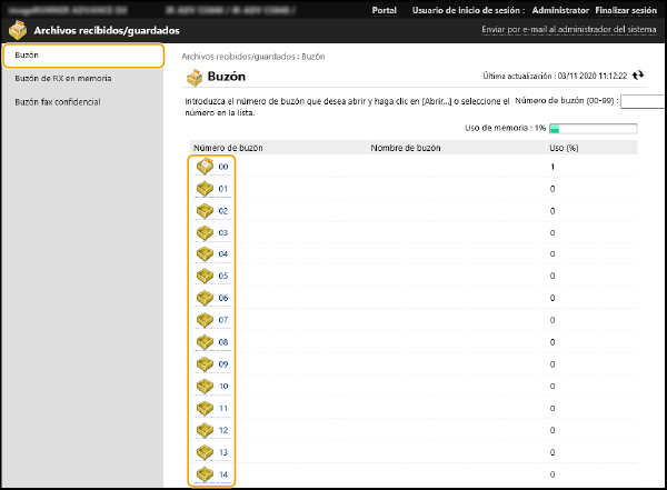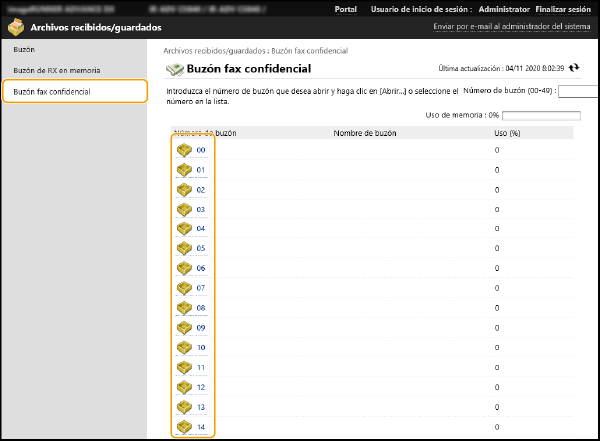 Seleccione la página [Buzón fax confidencial] y haga clic en el número de Buzón de fax.