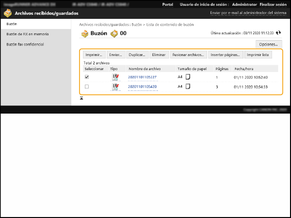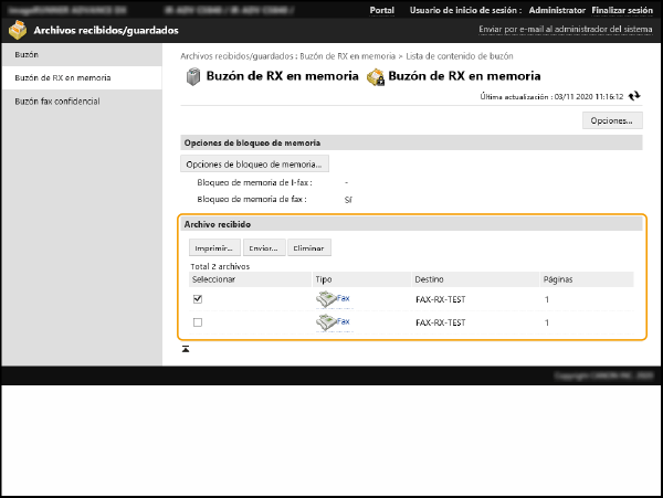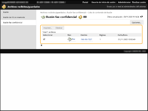 Gestionar documentos guardados temporalmente en el Buzón RX en memoria de este equipo