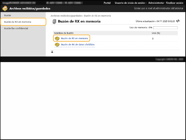 Seleccione [Buzón de RX en memoria] y haga clic en [Buzón de RX en memoria].