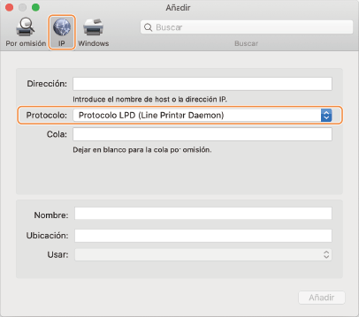 Haga clic en [IP] en la barra de herramientas y seleccione [Protocolo LPD (Line Printer Daemon)] en [Protocolo].