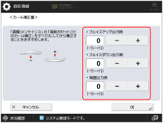 [フェイスアップ出力時]、[フェイスダウン出力時]または[両面出力時]の[-][+]を押して補正量を調整→[OK]を押す