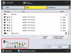 L'alimentation papier en cours d'utilisation est sur fond jaune dans l'image du coin inférieur gauche de l'écran.