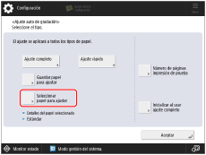 Confirme que [Estándar] (para el papel recomendado) o "el papel para la calibración que ha cargado en el paso 1" esté seleccionado en [Seleccionar papel para ajustar].