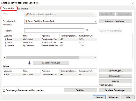 Wenn Sie eine Gruppe als Empfänger hinzufügen, wird die Nummer, die mit der höchsten Priorität eingestellt ist, für den Empfänger angezeigt. Stellen Sie die Nummer im Betriebssystem über [Bearbeiten]