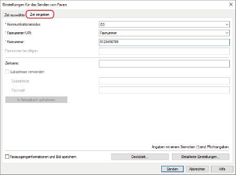 Geben Sie [Faxnummer] oder [URI] ein.