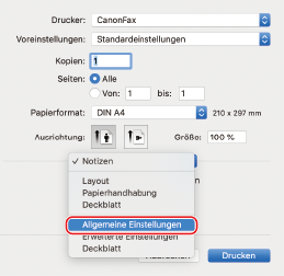 Wählen Sie aus dem Popup-Menü des Druckdialogfelds das Panel [Allgemeine Einstellungen] aus.