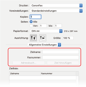Wählen Sie unter [Drucker] den Faxtreiber des Geräts aus.