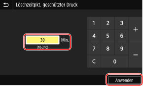 Ändern Sie den Zeitraum, über den ein geschütztes Dokument im Speicher verbleibt, und wählen Sie dann <Anwenden> aus.